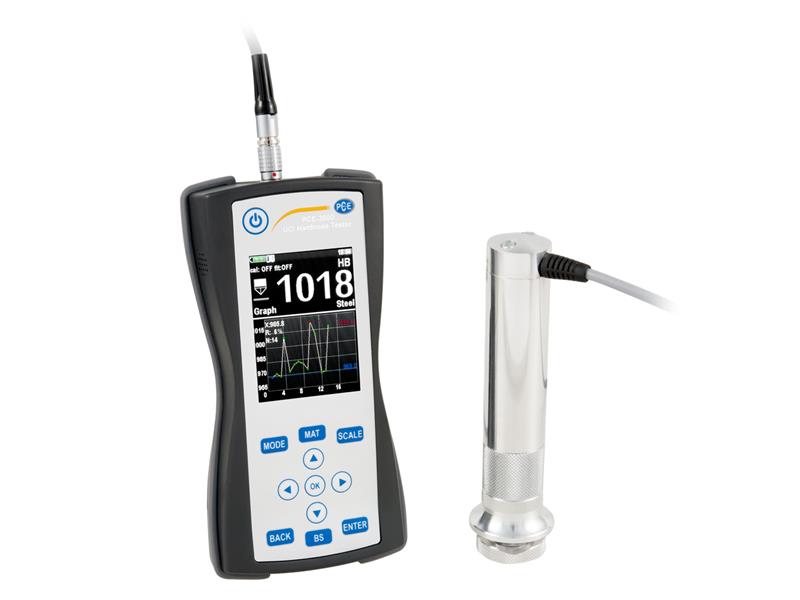 THE UCI HARDNESS TESTER PCE-3500 HAS BEEN DESIGNED FOR THE NON-DESTRUCTIVE HARDNESS MEASUREMENT OF METALLIC COMPONENTS. THE UCI HARDNESS TESTER WORKS ON THE BASIS OF THE ULTRASONIC CONTACT IMPEDANCE TEST PROCEDURE. THIS UCI PROCEDURE WORKS AS FOLLOWS: A V